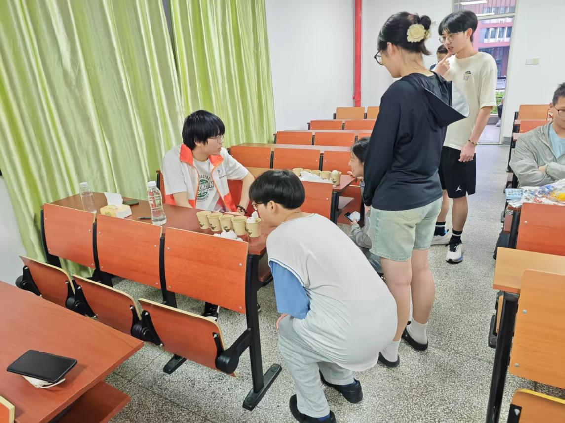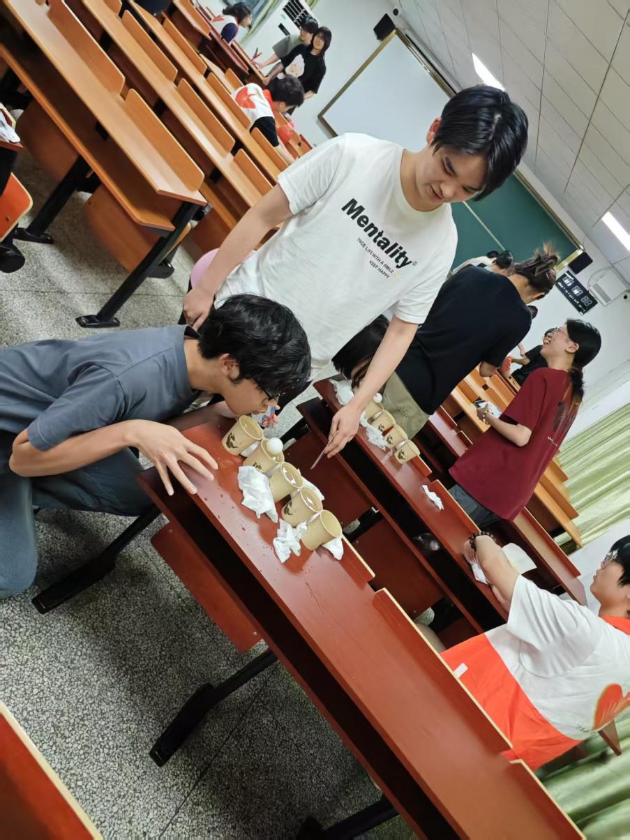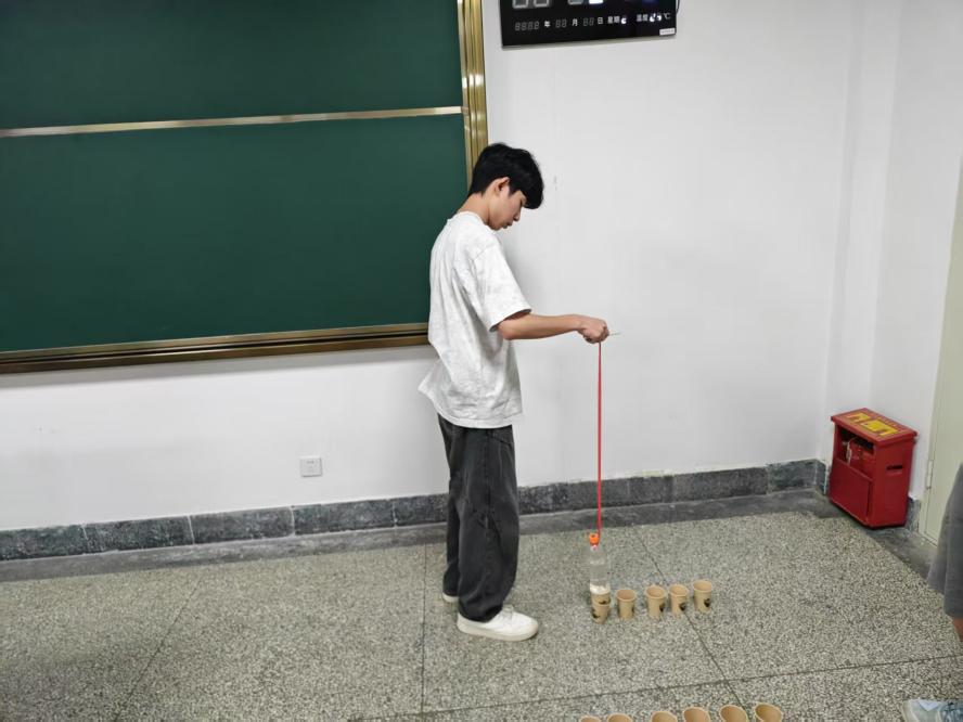 用细绳绑住矿泉水瓶,仅凭手腕力量操控瓶子“吊起”纸杯——这一项目看似简单,却让不少同学直呼“手抖”。现场屏息凝神的专注场景随处可见,有人稳如泰山,有人手忙脚乱,最终纸杯成功着陆时总会引发一片欢呼。一位参与者感慨:“原来耐心比速度更重要,这像极了学习中的坚持!”