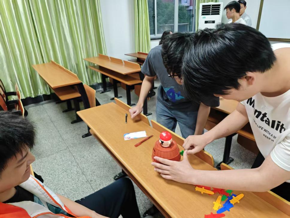 “插刀海盗桶”前围满了跃跃欲试的“冒险家”。参与者需轮流将塑料刀插入木桶,随时可能触发“海盗”弹跳的惊险瞬间。尖叫声与欢笑声此起彼伏,胆量与策略在此碰撞。“每次下刀都心跳加速,但大家一起加油打气的感觉太棒了!”游戏不仅锻炼胆识,更让同学们体会到团队支持的力量。